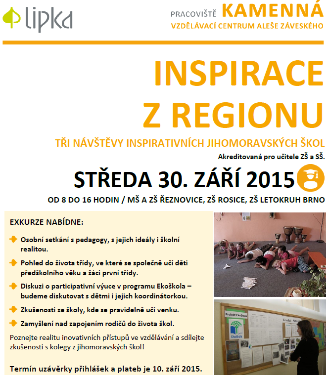 Lipka – školské zařízení pro environmentální vzdělávání pořádá 30. září 2015 pro pedagogy ze ZŠ exkurzi na vybrané školy v Jihomoravském kraji.