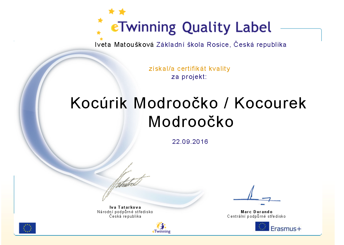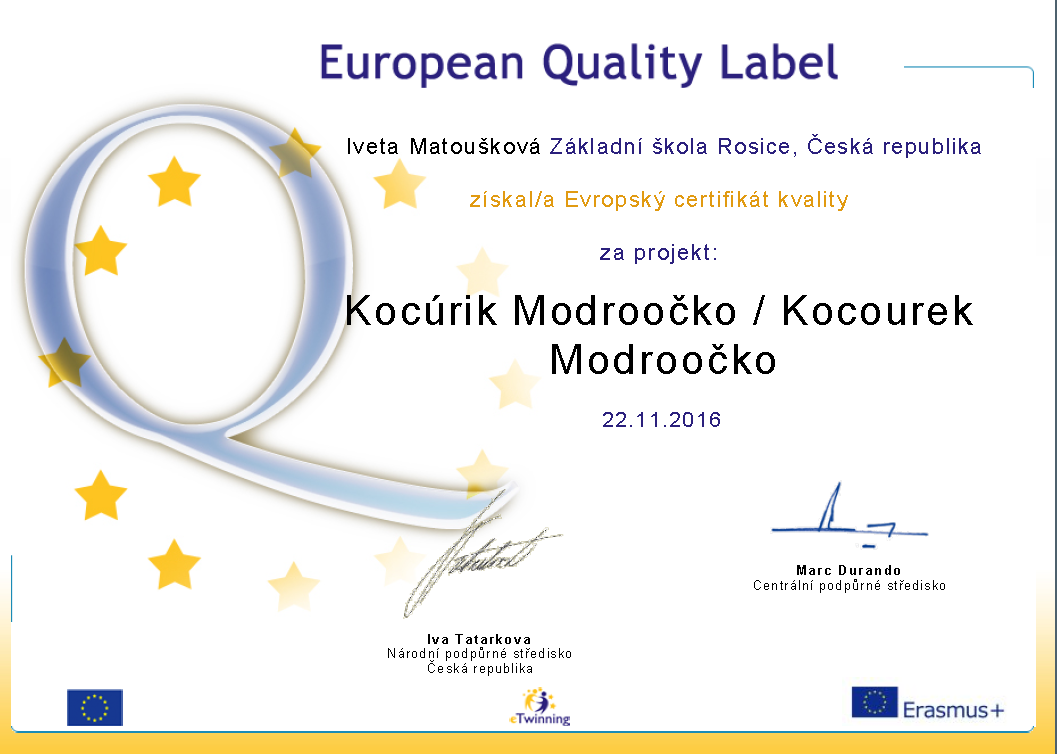 který jsme realizovali v minulém školním roce, byl na podzim oceněn certifikátem kvality - Quality Label i evropským certifikátem European quality label. Za tento úspěch na nás čekala sladká odměna i gratulace od vedení školy.