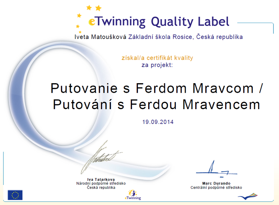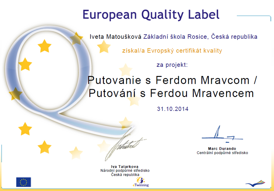 Na začátku října získal projekt Putování s Ferdou Mravencem certifikát kvality - Quality label - na národní konferenci v Hradci Králové. Na konci měsíce října jsme obdrželi i evropský certifikát. Dětem byly ceny a diplomy předány 31. 10. za přítomnosti paní zástupkyně pro první stupeň a pana ředitele Řezníčka.