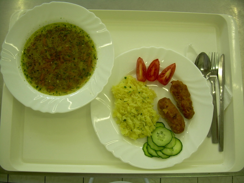 Čevabčiči, brambory, tatarka, zeleninová obloha
