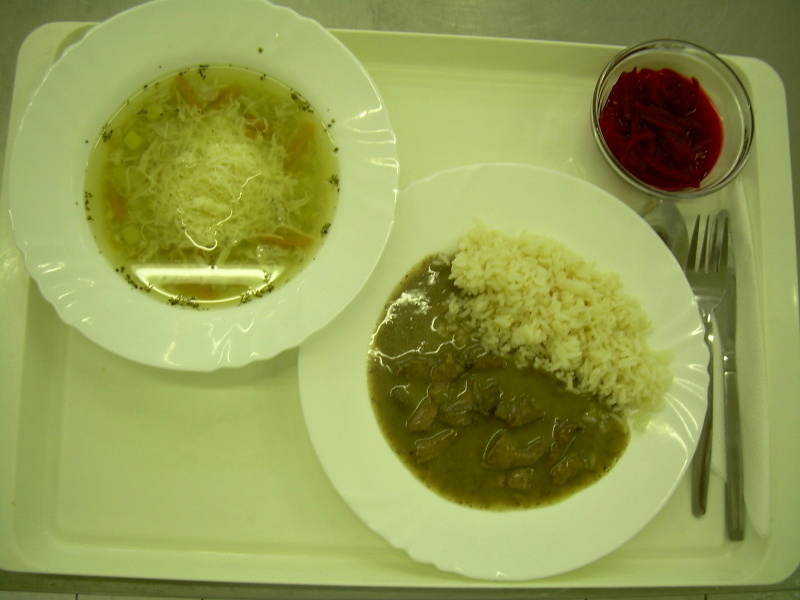 Vepřová játra na cibulce, rýže, červená řepa