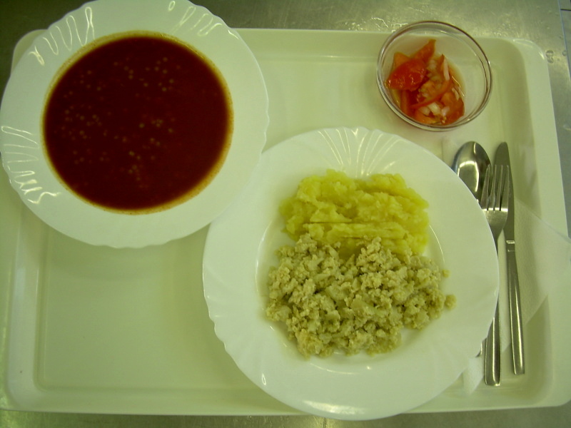 Cizrnová kaše, smažená cibulka, chléb, salát
